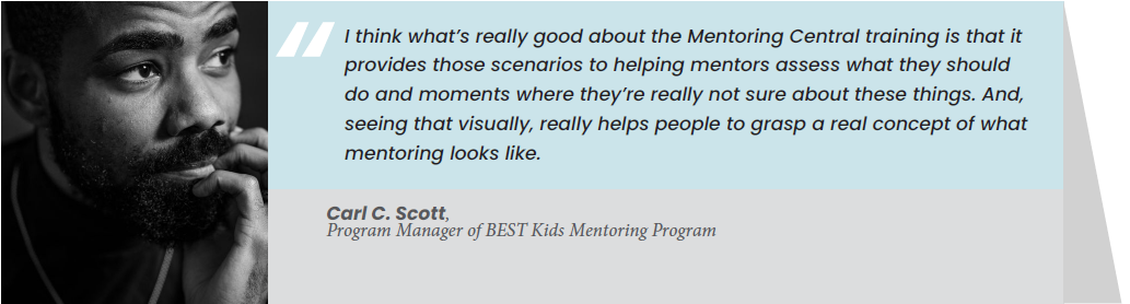 BEST Kids mentors who completed Mentoring Central’s Preparing for Mentoring Program say they feel more prepared, have more “tools in their toolbox,” and that the courses were simple to follow. By defining the responsibilities and roles of mentorship, the foundational courses allow their volunteers to create long-lasting relationships that are built upon realistic expectations, respect, and proper boundaries.